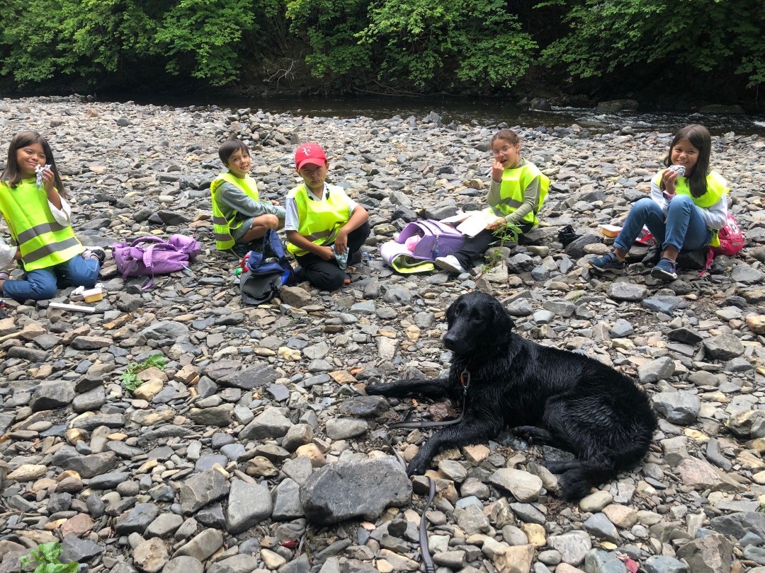 子供達の好奇心・可能性・意欲を大事にとにかく楽しむ。すると自然に学びが生まれてくる。その原点にもう一度立ち戻り、夏休み明け最初のクラスは川で写生会&オリジナルゲーム作り用の石集め。夏休み明けで日本語がほぼ出てこなかった子も帰るころにはそれはそれはおしゃべりちゃんに(笑)。教室犬ベイリーもお付きができて大満足。