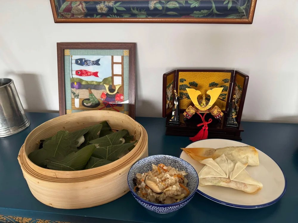 To celebrate Children's Day, we made "carp-shaped and helmet-shaped spring rolls," "kashiwa mochi," and "Chinese zongzi".子どもの日をお祝いして、みんなで「こいのぼり春巻き」や「兜の春巻き」、「柏餅」、そして炊飯器で作る「中華ちまき」を手作りしました。👦